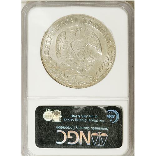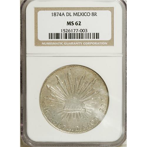 <B>Cap and Rays 8 Reales 1874-A DL,</B></I> KM-377, MS62 NGC, dipped but pleasant. Scarce.<BR><BR><b>Shipping:</b> Coins & Currency (<a target="_blank" href="http://www.heritageauctions.com/common/shipping.php">view shipping information</a>)