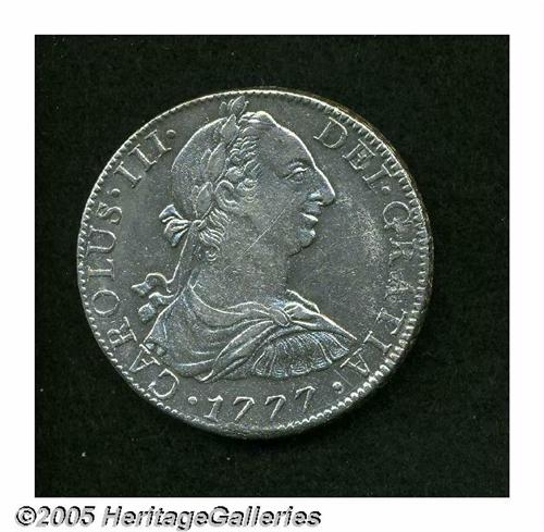 <B>Carlos III 8 Reales 1777-FM, </B></I>KM106.2, sharp XF+, considerable original luster despite having been cleaned, very light scratch on the King's cheek. Scarce grade.