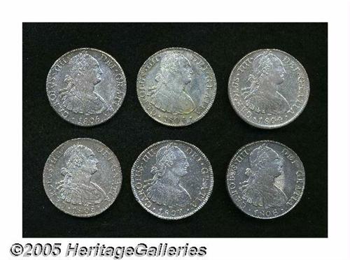 <B>Carlos IIII 8 Reales - High Grade Selection, </B></I>KM109, six pieces including: 1804-TH (2), 1805-TH, 1806-TH, 1807-TH, and 1808-TH. Despite light cleaning, this is an usually high grade group averaging better than XF. Definitely worth a careful look! <B>Sold as is, no return lot.</B></I>