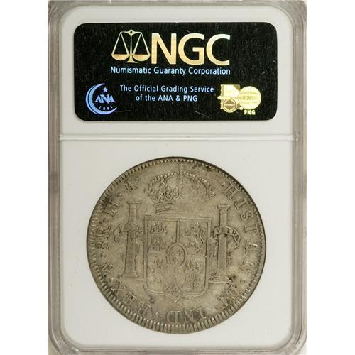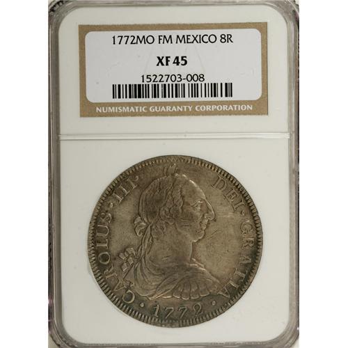 <B>Charles III 8 Reales 1772-Mo-FM, inverted assayer's initials,</B></I> KM106.1, Cayon-12000, XF45 NGC. Moderate to heavy marks with some softness on the obverse.<BR><BR><b>Shipping:</b> Coins & Currency (<a target="_blank" href="http://www.heritageauctions.com/common/shipping.php">view shipping information</a>)
