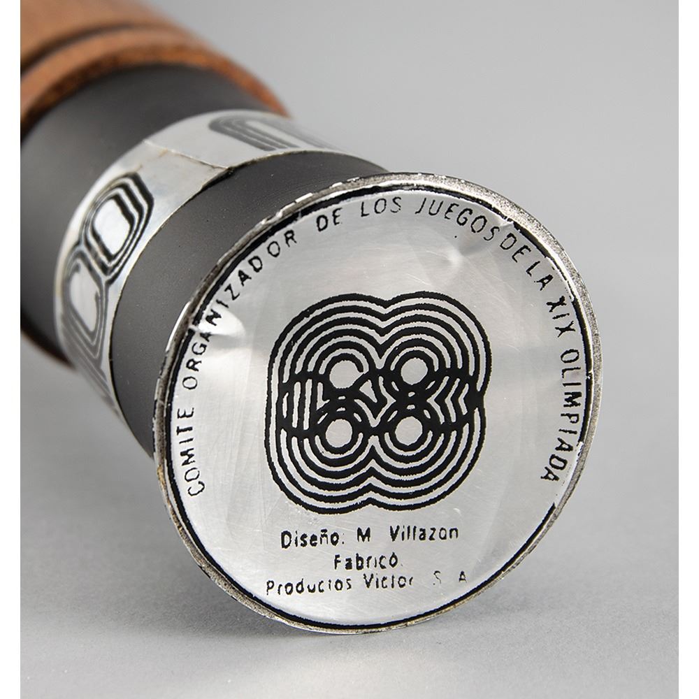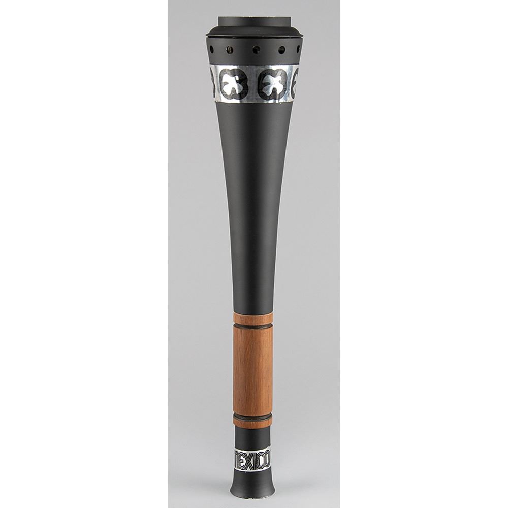 Official ‘Type 4’ torch from the Mexico 1968 Summer Olympics, constructed of black aluminum and a wooden handle, measuring 20.5Ë in length and 4Ë at its widest point. The upper metal ring features a pattern of six doves and the metallic label at the bottom reads “Mexico†twice. The base of the handle bears an affixed label that features the logo of the Games and names the designer, Manuel Villazon. The metallic bands exhibit some rippling, and the metal components are somewhat loose from the wooden handle.