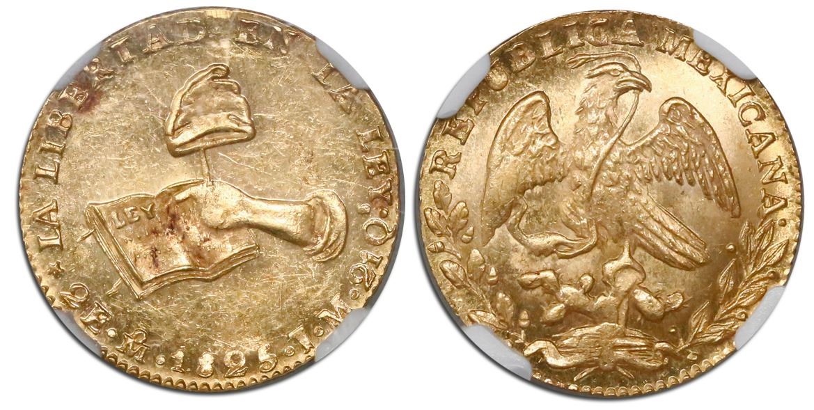 Mexico City, Mexico, 2 escudos, 1825JM, encapsulated NGC MS 63, finest known in NGC census.