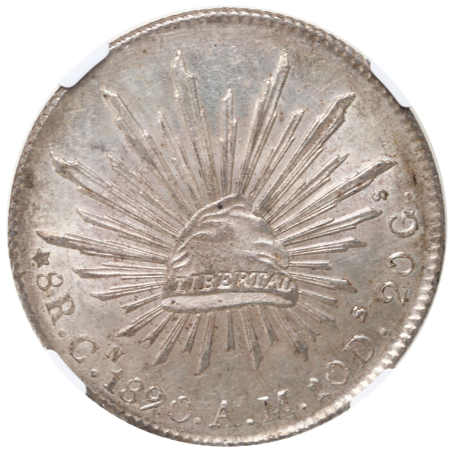 Mexico City, Mexico, cap-and-rays 8 reales, 1890 AM, NGC MS 63.
