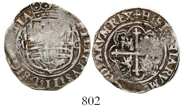 Mexico City, Mexico, cob 1 real, Philip II, assayer O to right. S-M11; KM-26; CT-643. 3.25 grams. Broad flan with bold and nearly full legends and crown, the shield and cross full but partially flat, AVF with brown toning on fields.