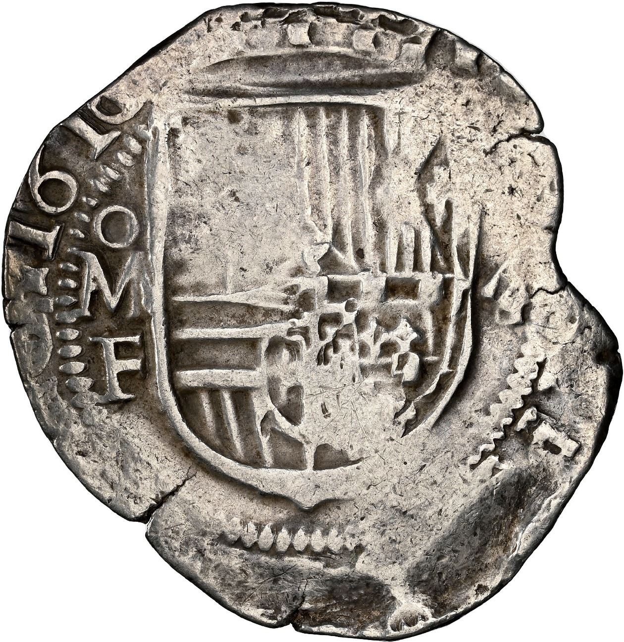 Mexico City, Mexico, cob 4 reales, 1610 F, very rare, NGC XF details / cleaned, finest and only example in NGC census. S-M17; KM-37.2; Cal-755. 13.34 grams. Superb full cross-lions-castles, good full shield with very bold full oMF and 161 of date followed by what looks a little like 1/0 but with the 0 stronger than the 1, out-of-round shape with a few minor edge-splits, toned in crevices. Pedigreed to the Clyde Hubbard Collection, with his original tag/envelope. Please use this link to verify the certification number