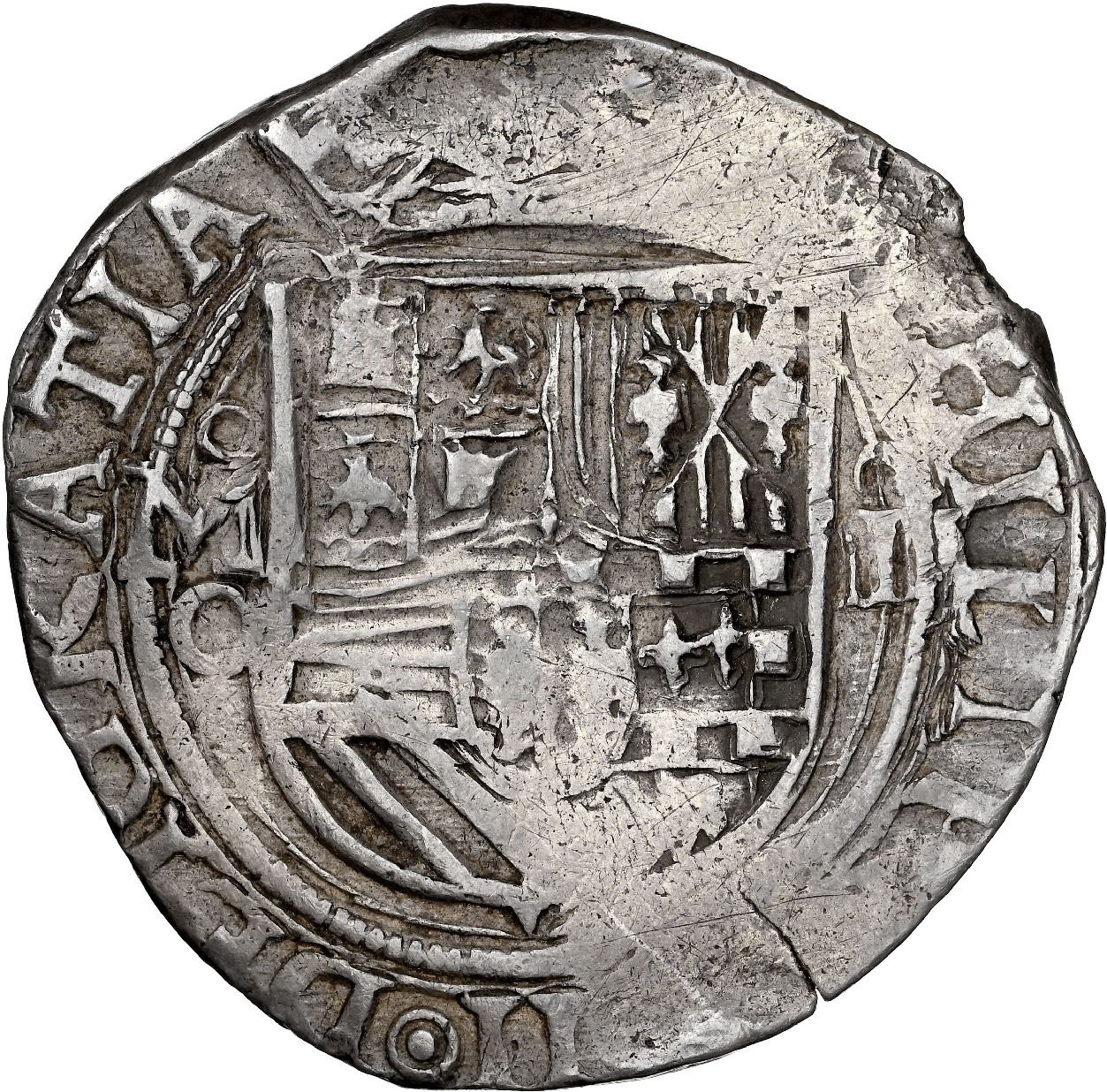 Mexico City, Mexico, cob 4 reales, Philip II, assayer O below mintmark oM to left, dot-in-circle stops in legend (very rare), NGC AU 53. S-M11; KM-36; Cal-505. 13.46 grams. Broad flan with nearly full legends and good full shield and cross despite some slightly weak areas, interesting legend variety (not noted by NGC), unevenly toned. Pedigreed to the Clyde Hubbard Collection, with his original tag/envelope showing a partial rubbing of the coin's obverse. Please use this link to verify the certification number