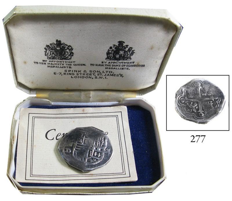 Mexico City, Mexico, cob 4 reales, Philip IV, assayer D (possible D/F), with Spink promotional box. S-M18a, KM-38. 13.5 grams. Very bold assayer D with something underneath (could just be another D), full and well-centered shield and cross, somewhat flat but no corrosion. With original Spink box (1960s) and small certificate. Recovered from: “Lucayan Beach wreck,” sunk ca. 1628 off Grand Bahama Island