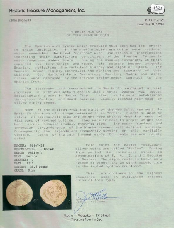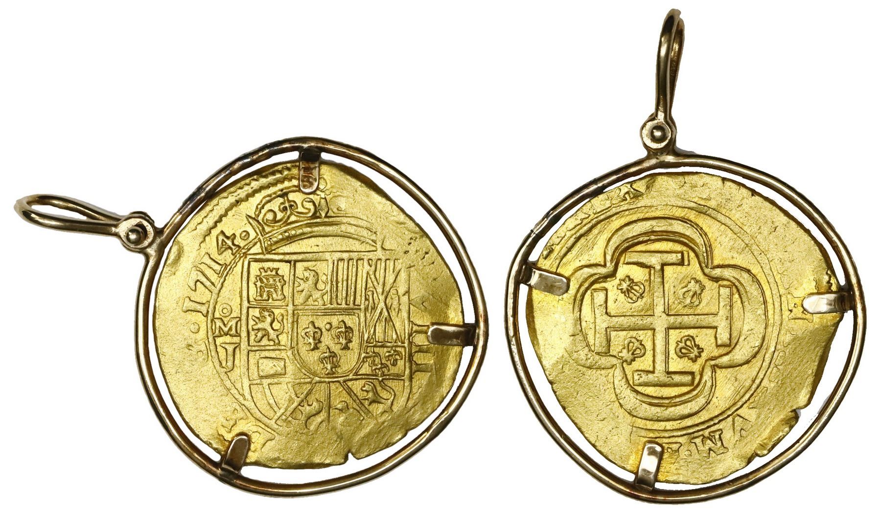 Mexico City, Mexico, cob 8 escudos, 1714J, ex-1715 Fleet, mounted cross-side out in 18K bezel with shackle bail. 31.21 grams total. Choice coin with 100% bold and full date and oMJ, plus well-detailed full shield and cross-and-tressure, plus nearly full crown, AU details for grade. From the 1715 Fleet, with photo-certificate.