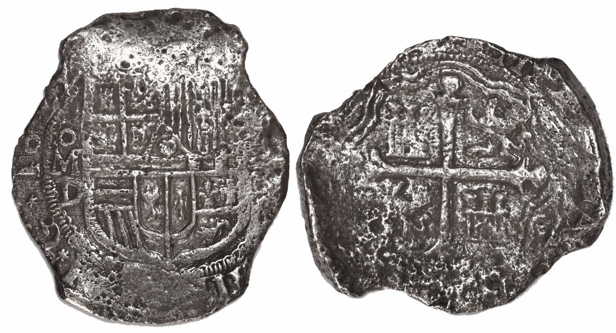 Mexico City, Mexico, cob 8 reales, 1622D, Grade 1, rare, with original tag but certificate missing. 23.64 grams. Classic barrel-shaped flan with choice full shield and cross, clear date (very desirable as the date of the wreck), bold oMD, light corrosion only and typically silvery. Pedigreed to our Auction #9, with original lot-tag #535, and with Fisher tag #183567. Recovered from: Atocha, sunk in 1622 west of Key West, Florida
