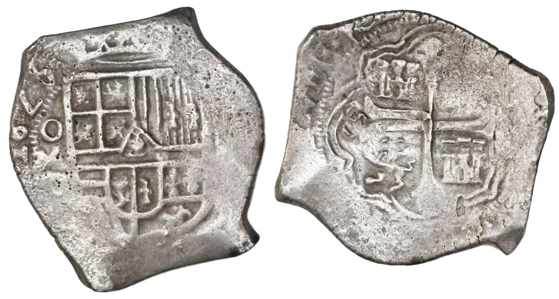 Mexico City, Mexico, cob 8 reales, 1623/1D, unique overdate. S-M18a. 25.49 grams. Barrel-shaped flan with slight concavity, choice full shield with full mintmark and very clear date with certain 3/1 overdate, choice full cross, XF with no corrosion but a few tiny pits that could indicate salvage (probably "Lucayan Beach wreck" of ca. 1628). Pedigreed to the Ponterio auction of November 2007 (lot #626).