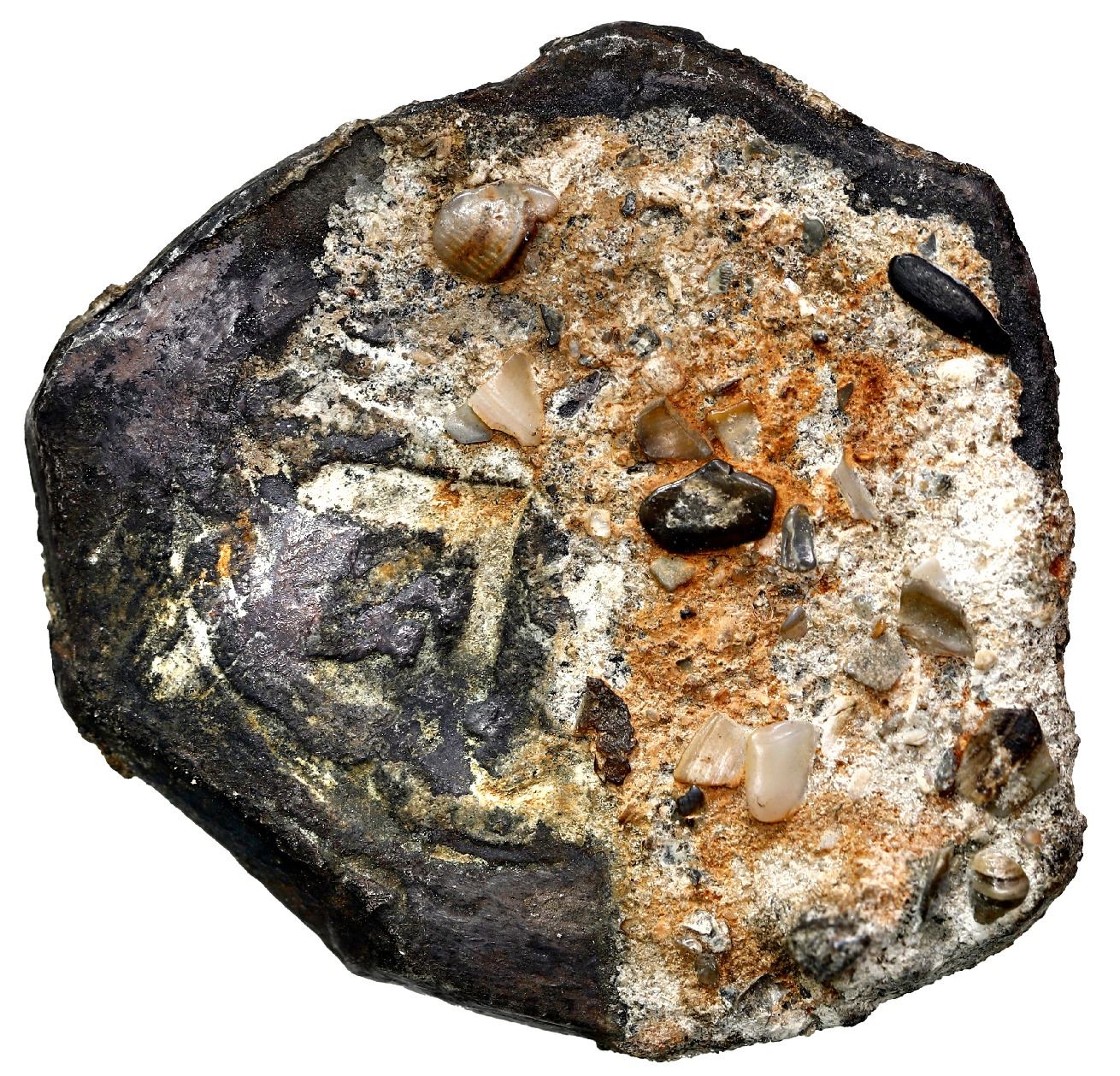 Mexico City, Mexico, cob 8 reales, Philip IV, assayer not visible (P), encrusted as found. S-M19; KM-45. 25.46 grams. Attractively loaded on both sides with white encrustation containing shell bits, only part of the cross peeking through, one of very few uncleaned coins we have seen from this wreck. Recovered from: Maravillas, sunk in 1656 off Grand Bahama Island