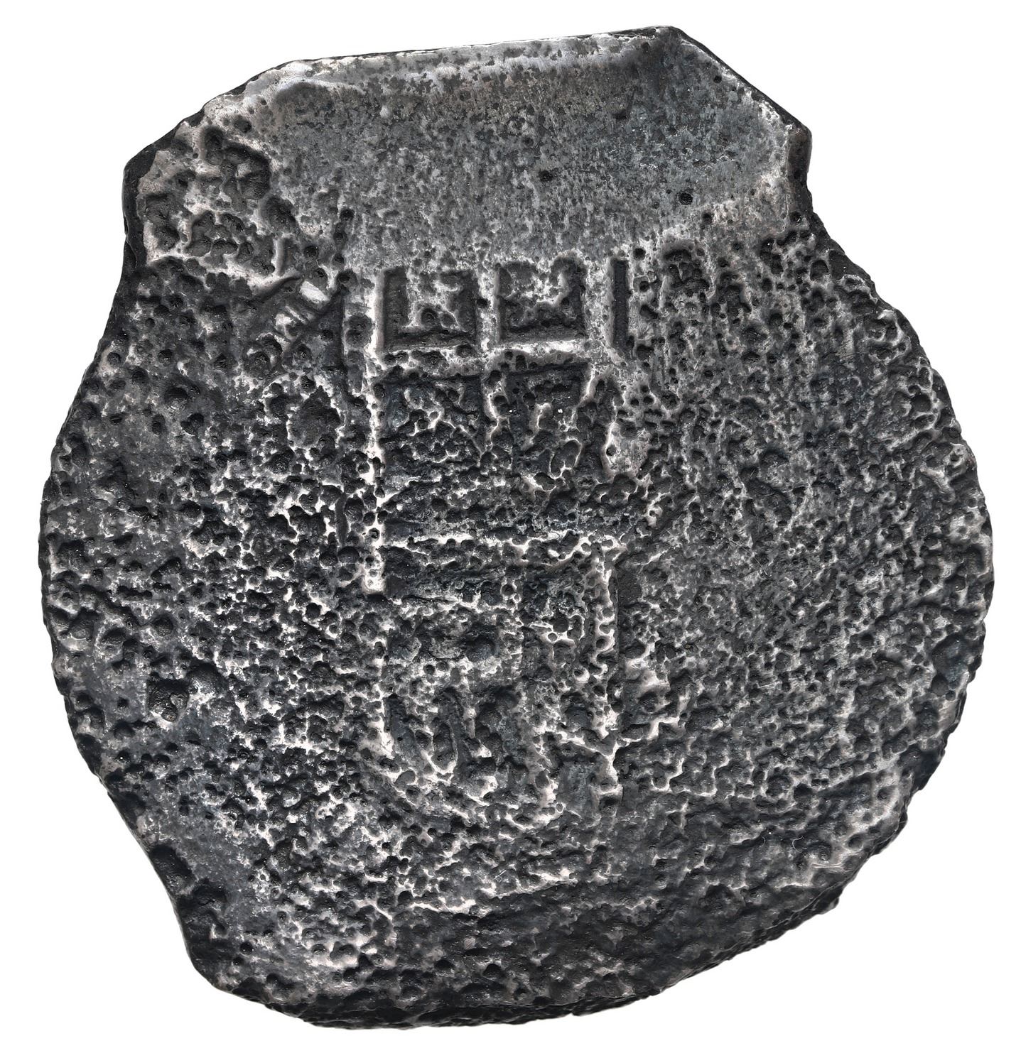 Mexico City, Mexico, cob 8 reales, Philip IV, assayer not visible, ex-Spink. KM-45. 24.40 grams. Solid flan but with some pitting from corrosion, off-center shield, very darkly toned all over. With original Spink clamshell box from the 1960s. From: "Lucayan Beach wreck," sunk ca. 1628 off Grand Bahama Island