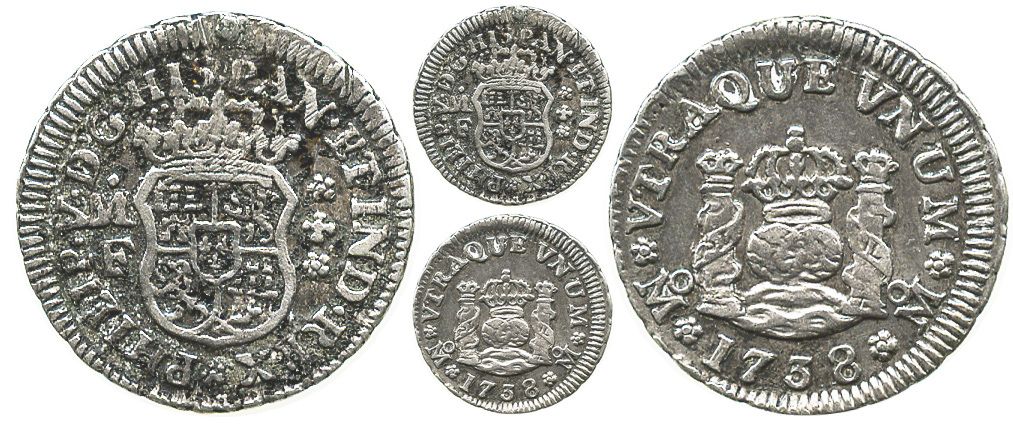Mexico City, Mexico, pillar 1/2 real, Philip V, 1738MF. KM-65; CT-1862. 1.7 grams. Slightly off-center XF with good toning, dark encrustation on shield-side surface, nice contrast.