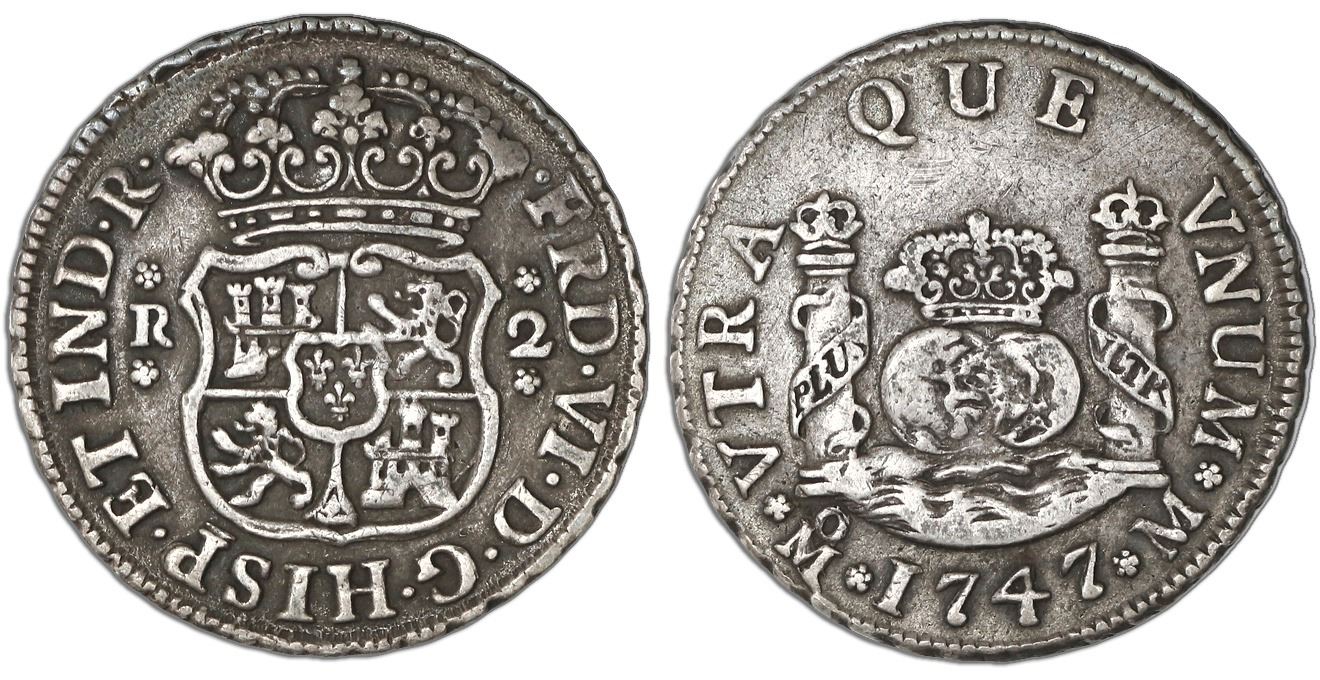 Mexico City, Mexico, pillar 2 reales, Ferdinand VI, 1747M, pellets at beginning and end of shield-si