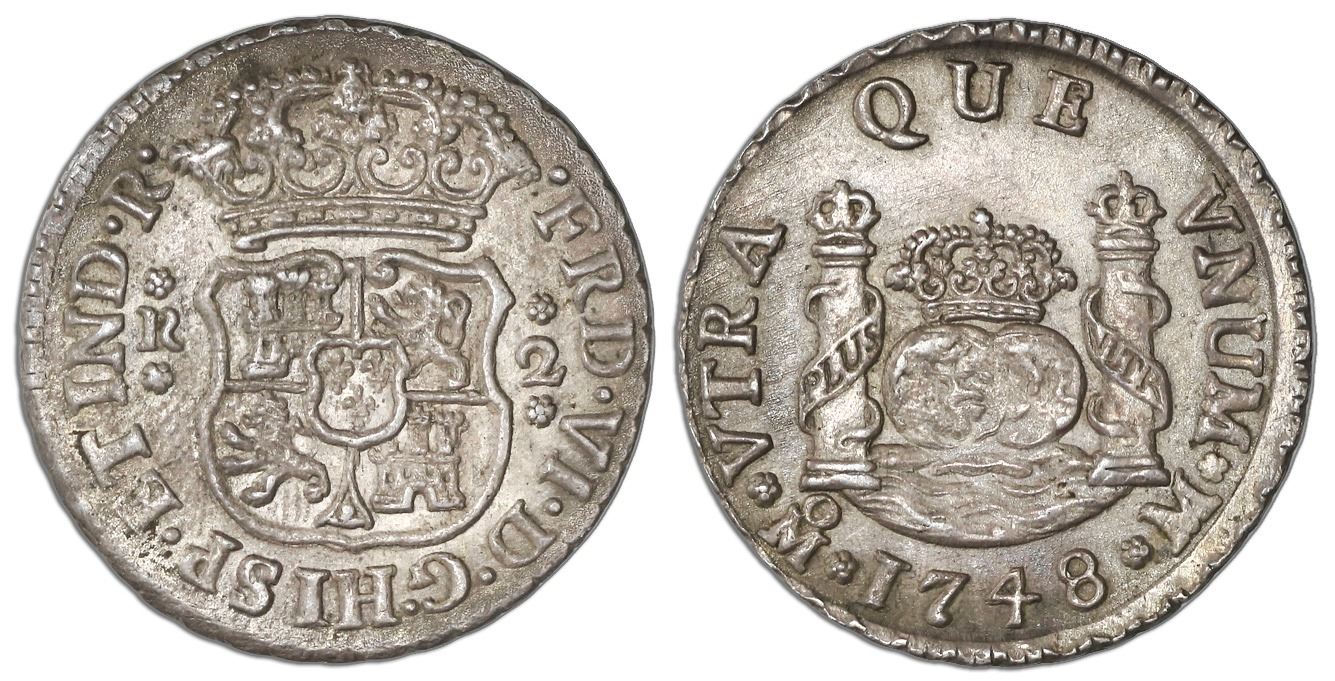 Mexico City, Mexico, pillar 2 reales, Ferdinand VI, 1748M, pellets at beginning and end of shield-si