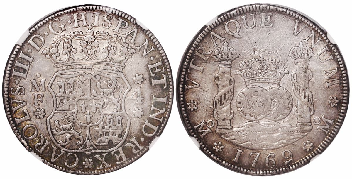Mexico City, Mexico, pillar 4 reales, Charles III, 1769MF, encapsulated NGC VF 30, ex-Rudman. Somewhat light strike with a few stray marks but nice overall, with rainbow toning at rim on shield side. Pedigreed to the Isaac Rudman collection.
