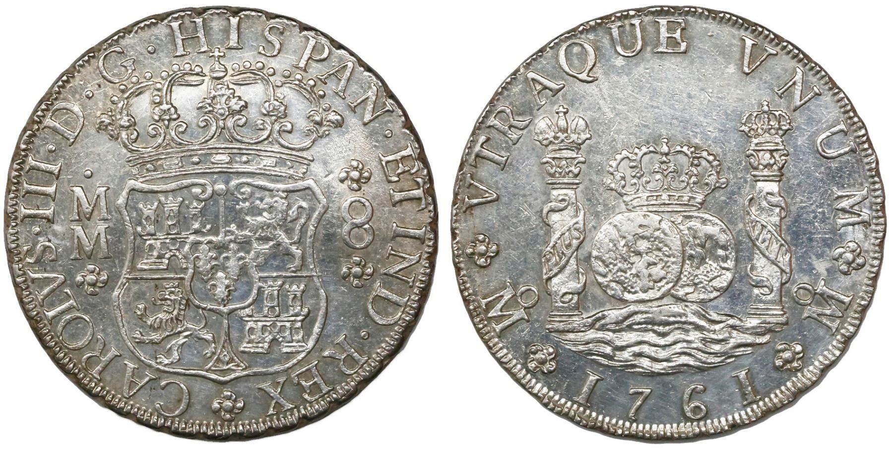 Mexico City, Mexico, pillar 8 reales, Charles III, 1761MM, tip of cross between H and I.