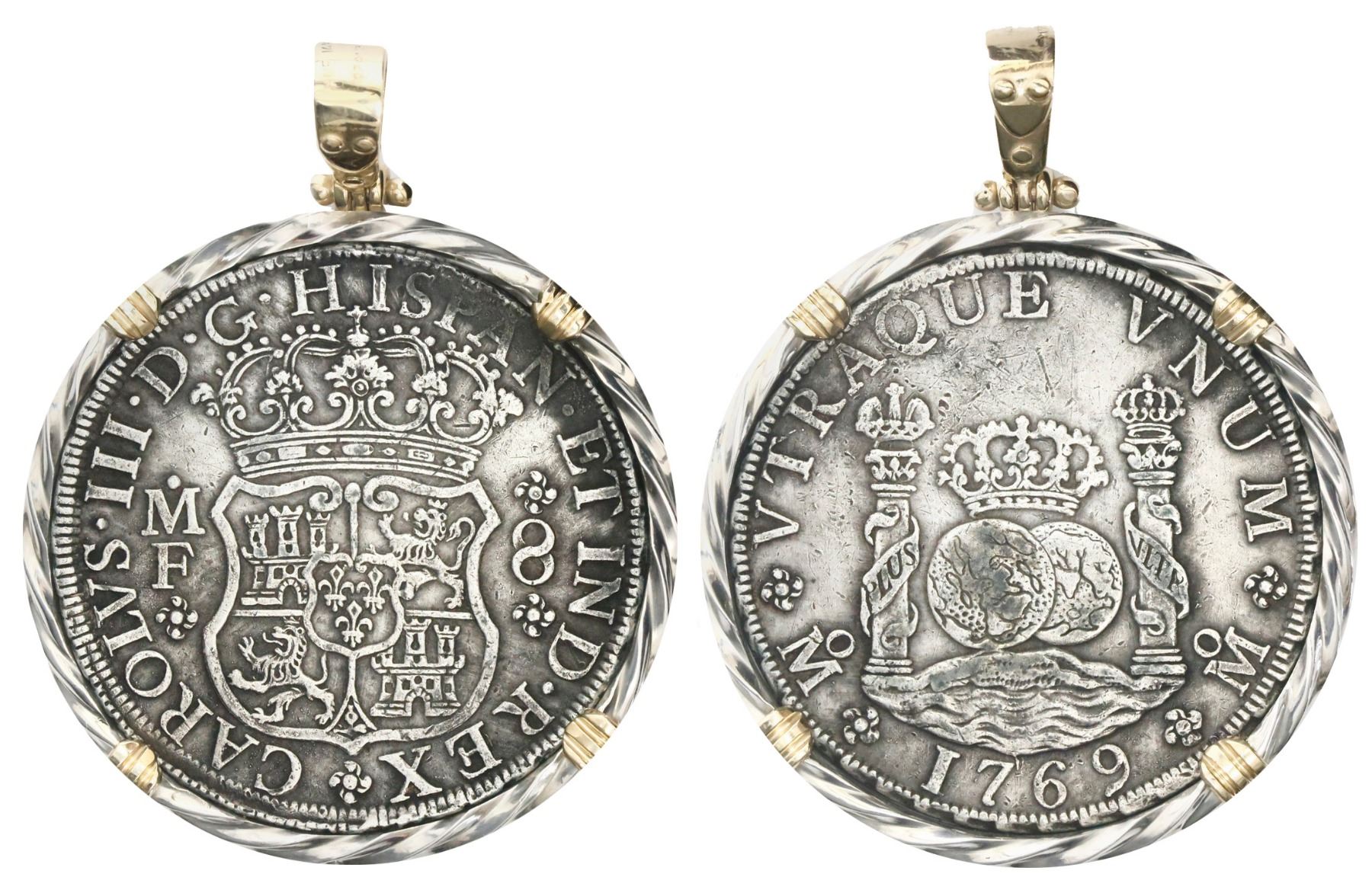 Mexico City, Mexico, pillar 8 reales, Charles III, 1769MF, mounted in twisted-wire silver bezel with 14K gold prongs and shackle bail. 37.16 grams total. Well-toned AXF with only minor marks, a large and impressive pendant.