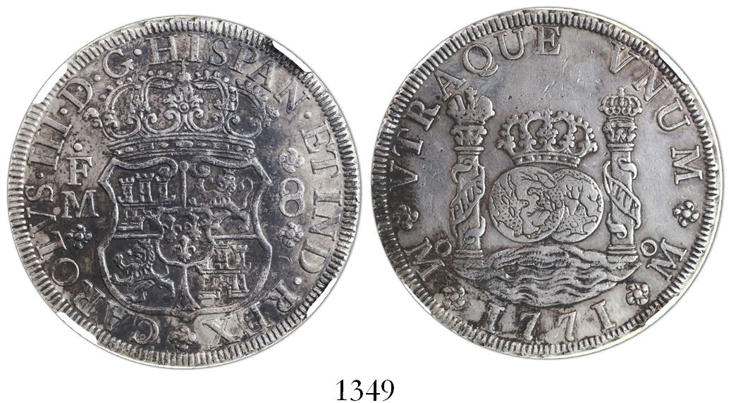 Mexico City, Mexico, pillar 8 reales, Charles III, 1771FM, encapsulated NGC XF details / surface hai