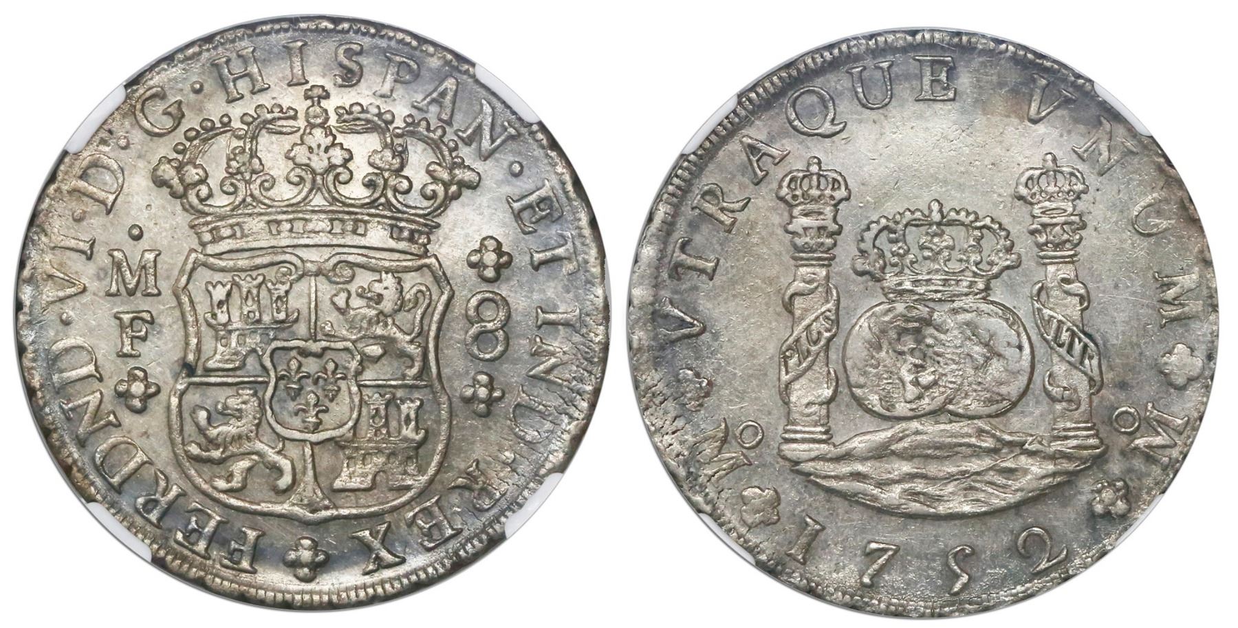 Mexico City, Mexico, pillar 8 reales, Ferdinand VI, 1752MF, encapsulated NGC MS 61. KM-104.1; CT-329. Bold strike against lustrous fields, very light toning, minor die-crack on waves and slight weak spot at left-hand mintmark, tied with five others for second highest grade at NGC (behind three MS 63's). NGC #4427718-011.