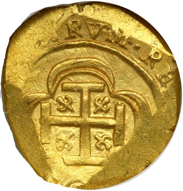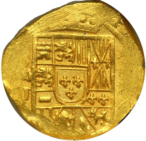 Mexico. Cob 2 Escudos, ND (1708-31)-Mo J. Fr-7b; KM-53.2. Philip V, 1700-1746. Crowned arms. Reverse: Cross. Although the date is off the flan, the razor sharp strike of this coin is excellent. NGC graded MS-63.