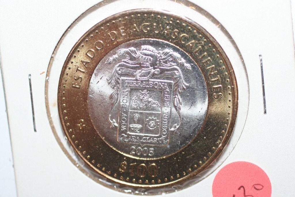 This lot is a 2005 mexico state of aguascalientes $100 pesos bi-metallic coin