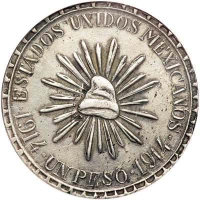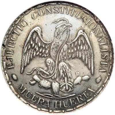Mexico - Durango. Peso, 1914. KM-622. Eagle with dot and dash border. Reverse: Liberty cap with continuous border. NGC graded AU-53.