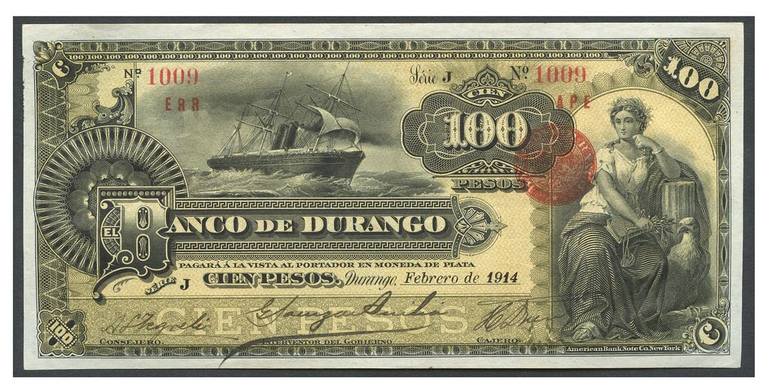 Mexico, El Banco de Durango, 100 pesos, February 1914, series J, serial 1009. Pick-S277A, Frampton-M338a. Crisp UNC, no issues.