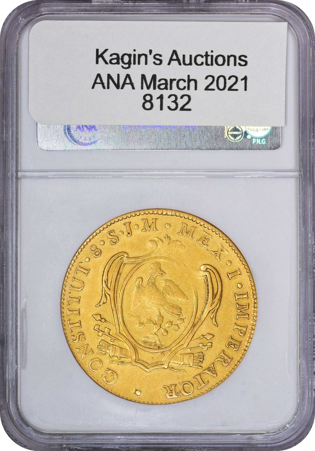 Description: Dies as illustrated. The warm yellow-gold surfaces offer mark-free quality throughout, as well as lustrous mint bloom in the protected design areas. Some old hairlines and perhaps traces of a thumbing that occurred long ago are present, but you need to know what you’re looking for. The piece has recovered so nicely over the years from what was once a commonplace occurrence that, even in 2005, NGC thought nothing of the overall effects on the coin and called it EF-40 without a qualifier. A rare issue from the waning months of Iturbide’s shaky and unpopular reign, and scarcer than its 1822-dated 8 escudos counterpart. The pedigree chain here is numismatically impeccable: John H. Clapp; the Clapp Estate; Louis E. Eliasberg, Sr.; an unnamed intermediary; and now, you! This is only the second auction appearance of this coin since 1942 – ANR in 2005, and now Kagin’s Inc. in 2021. The search for one fortunate aficionado ends here; we hope the underbidders don’t have to wait 16 more years for their next chance.