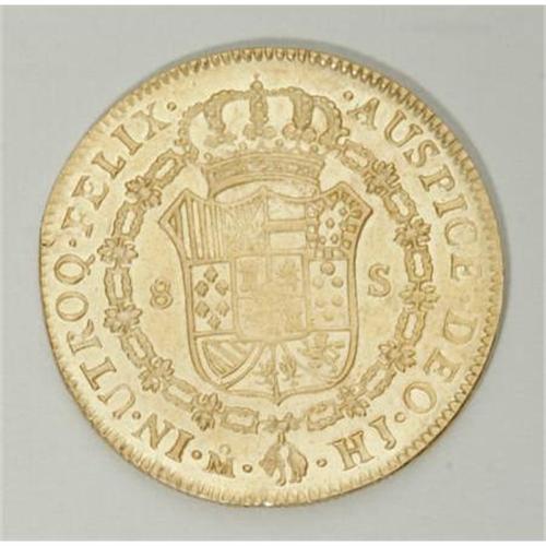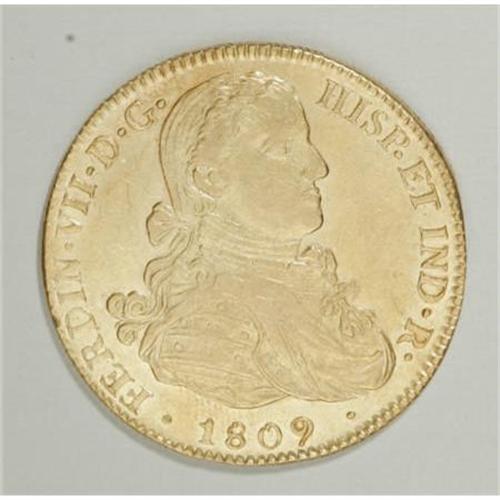 <B>Ferdinand VII gold 8 Escudos 1809Mo-HJ,</B></I> KM160, superb AU, fully brilliant and extremely attractive. Much of the luster in the obverse legends and on the reverse is prooflike. Rare and highly desirable in this select quality. Ex: Superior Dec 1999, Lot 269.<BR><BR><b>Shipping:</b> Coins & Currency (<a target="_blank" href="http://www.heritageauctions.com/common/shipping.php">view shipping information</a>)
