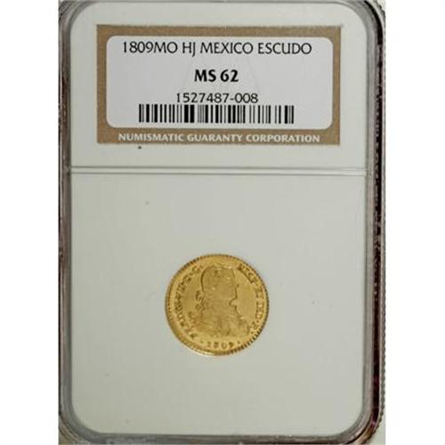<B>Ferdinand VII gold Escudo 1809Mo-HJ,</B></I> KM121, MS62 NGC, fully lustrous and bold, an appealing example of this very scarce type featuring the military bust of the King.<BR><BR><b>Shipping:</b> Coins & Currency (<a target="_blank" href="http://www.heritageauctions.com/common/shipping.php">view shipping information</a>)