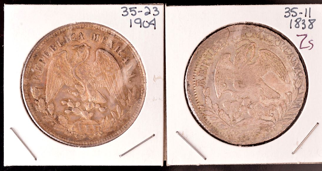 Mexico, First Republic, Zacatecas Mint, 8 Reales, 1838, O.M., EF+, rough flan; Second Republic, Peso, 1904, Zs F.Z., MS-62; a nice pair