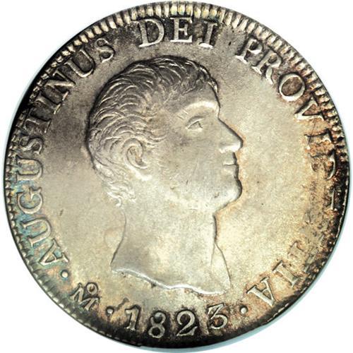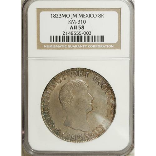 <B>Iturbide 8 Reales 1823-Mo JM,</B></I> KM-310, AU58 NGC, even light golden gray toning, quite a decent portrait of Augustin, and the eagle is fairly well defined, but some lettering is very weakly impressed. Almost no marks. Quite collectible!<BR><BR><b>Shipping:</b> Coins & Currency (<a target="_blank" href="http://www.heritageauctions.com/common/shipping.php">view shipping information</a>)