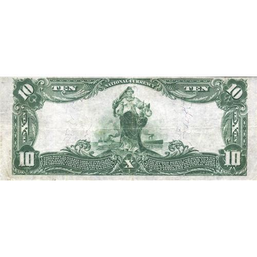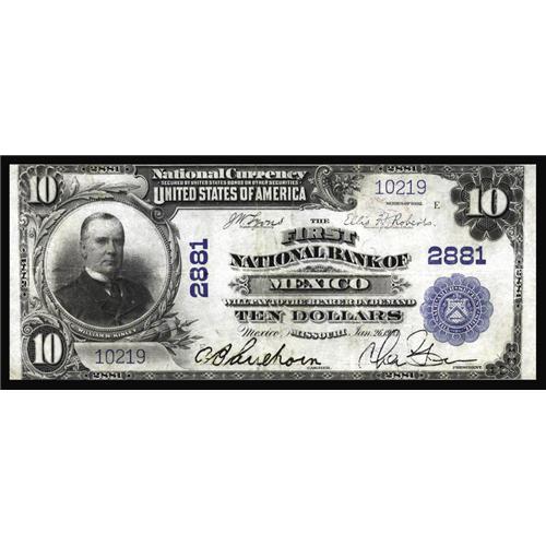 <B>Mexico, MO</B></I> - $10 1902 Plain Back Fr. 624 <B>The First NB</B></I> Ch. # 2881<BR>The pen signatures are still very strong on this popular misplaced name note. Less than one dozen large size notes are known on this bank, which was the only institution in Mexico to issue National Bank Notes. <B>Very Fine.</B></I>