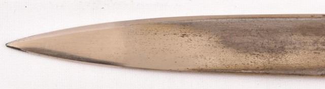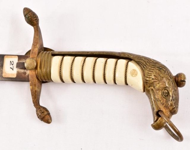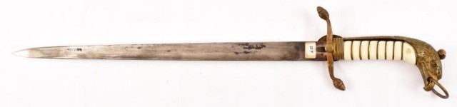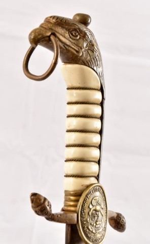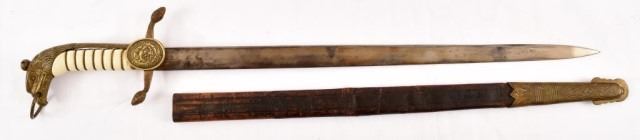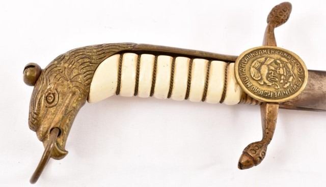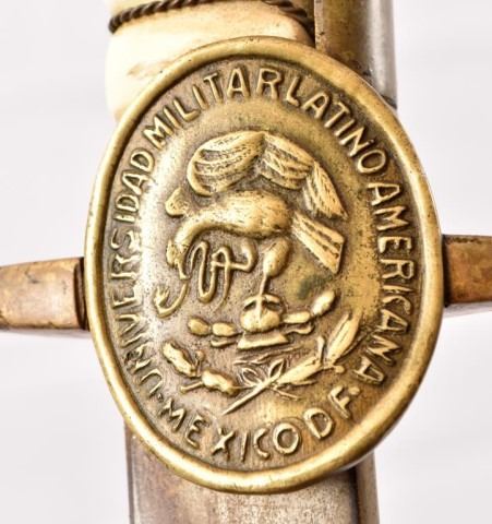 Mexico. Eagle Head pommel with ring through beak. White celluloid grip, wire wrap. Cast langet with 19th century Mexican Arms surrounded by "UNIVERSIDAD MILITAR LATINO AMERICANA MEXICO DF" Black leather scabbard