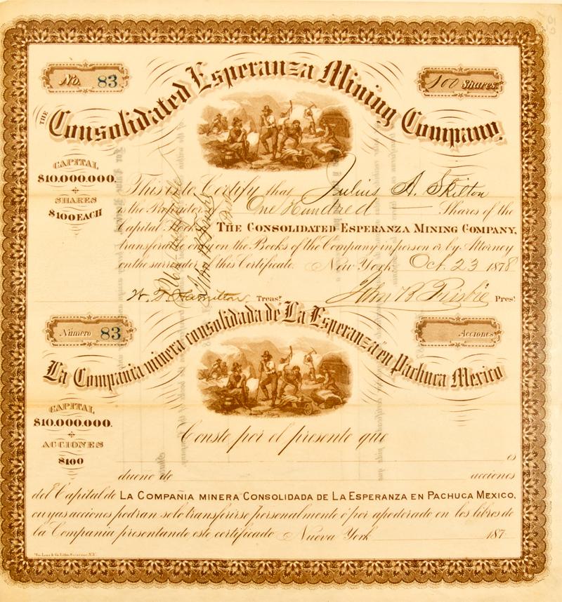 Incorporated in 1878, this is a bilingual stock. The top half is in English, complete with vignette and signatures. The bottom half is in Spanish and is not filled out. Our consignor notes that only one language needs to be filled in, so this stock is fully issued. Cert. #83 is issued to Julius A. Skilton for 100 shares. Signed by John R. Frisbie, President, and W. T. Hamilton, Treasurer. Vignette is of 8 miners working with picks and shovels at the foot of some hills. Brown border and print, with embossed seal. Uncancelled. Printer: Wm. Lee & Co., New York. Datelined New York. 11 x 12.” This company was located in the largest silver mining district in Mexico. The district has produced over 1.5 billion ounces silver, and Pachuca has also produced over 7 millions ounces of gold.