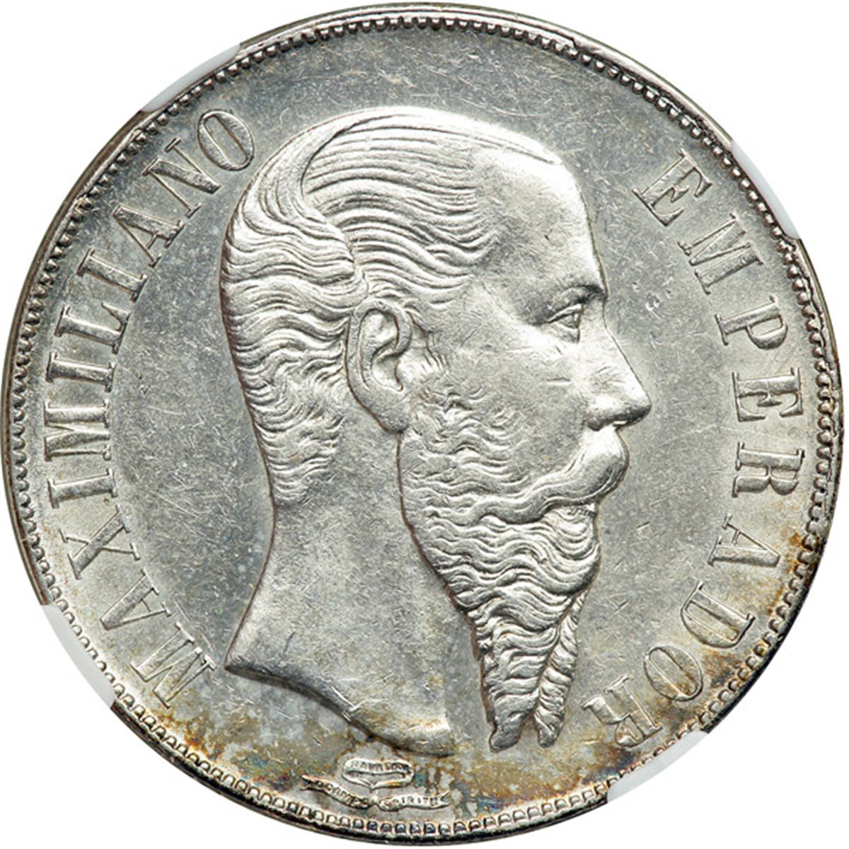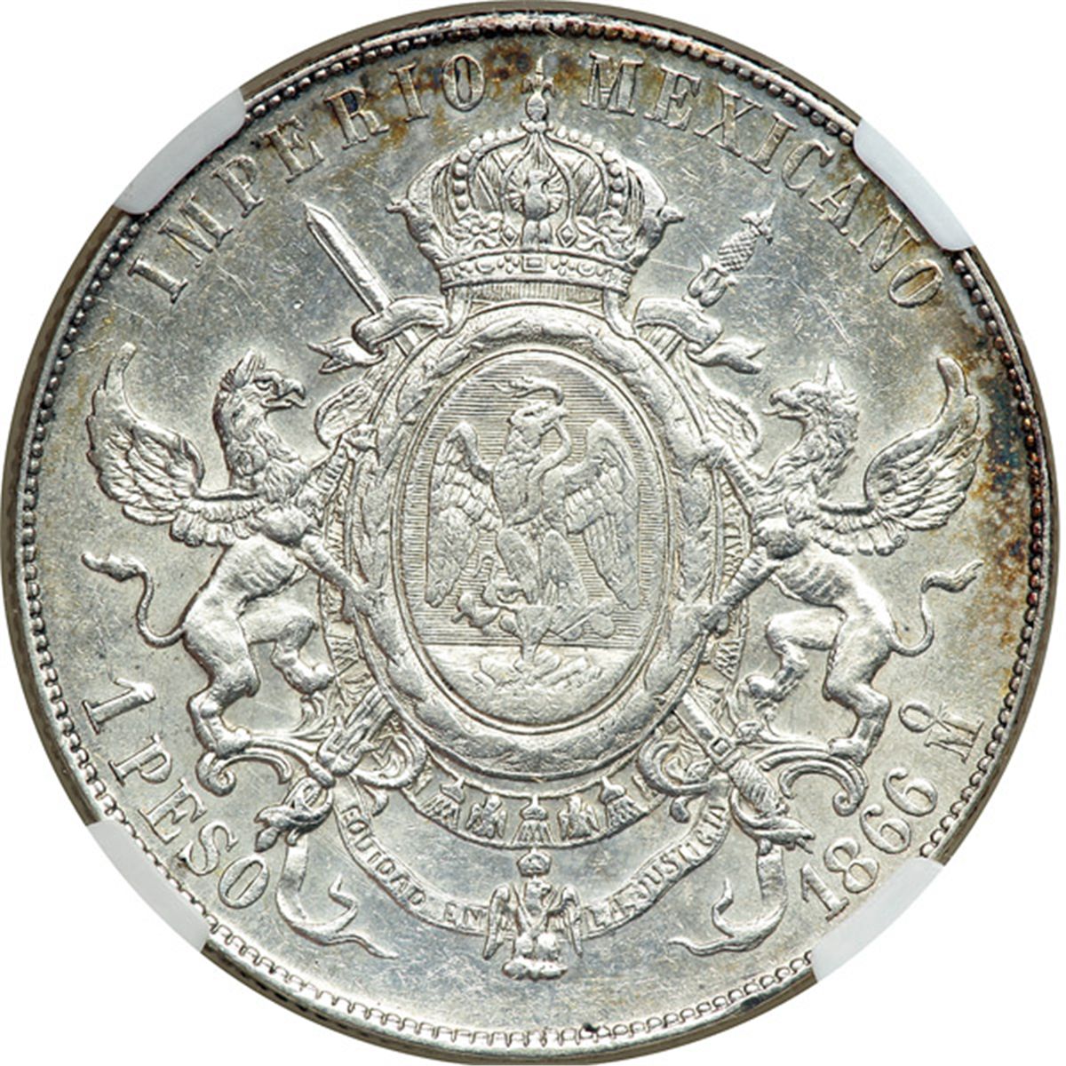 Mexico. Peso, 1866-Mo. Eliz-172; KM-388.1. Maximilian, Emperor, 1864-1867. Considerable amount of luster. NGC graded AU-55.