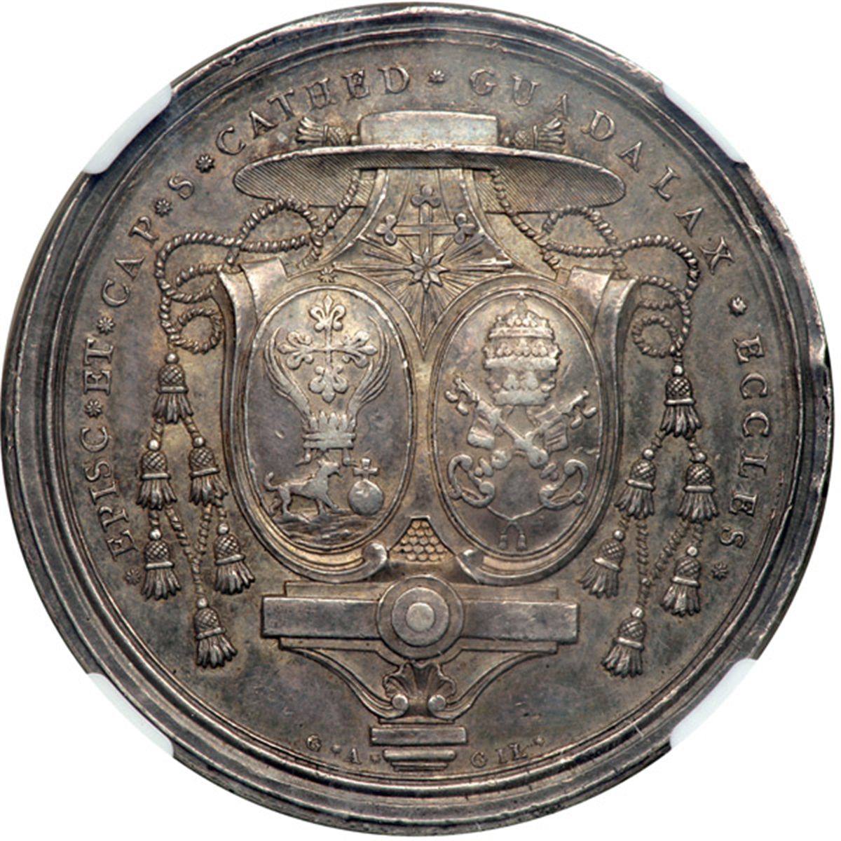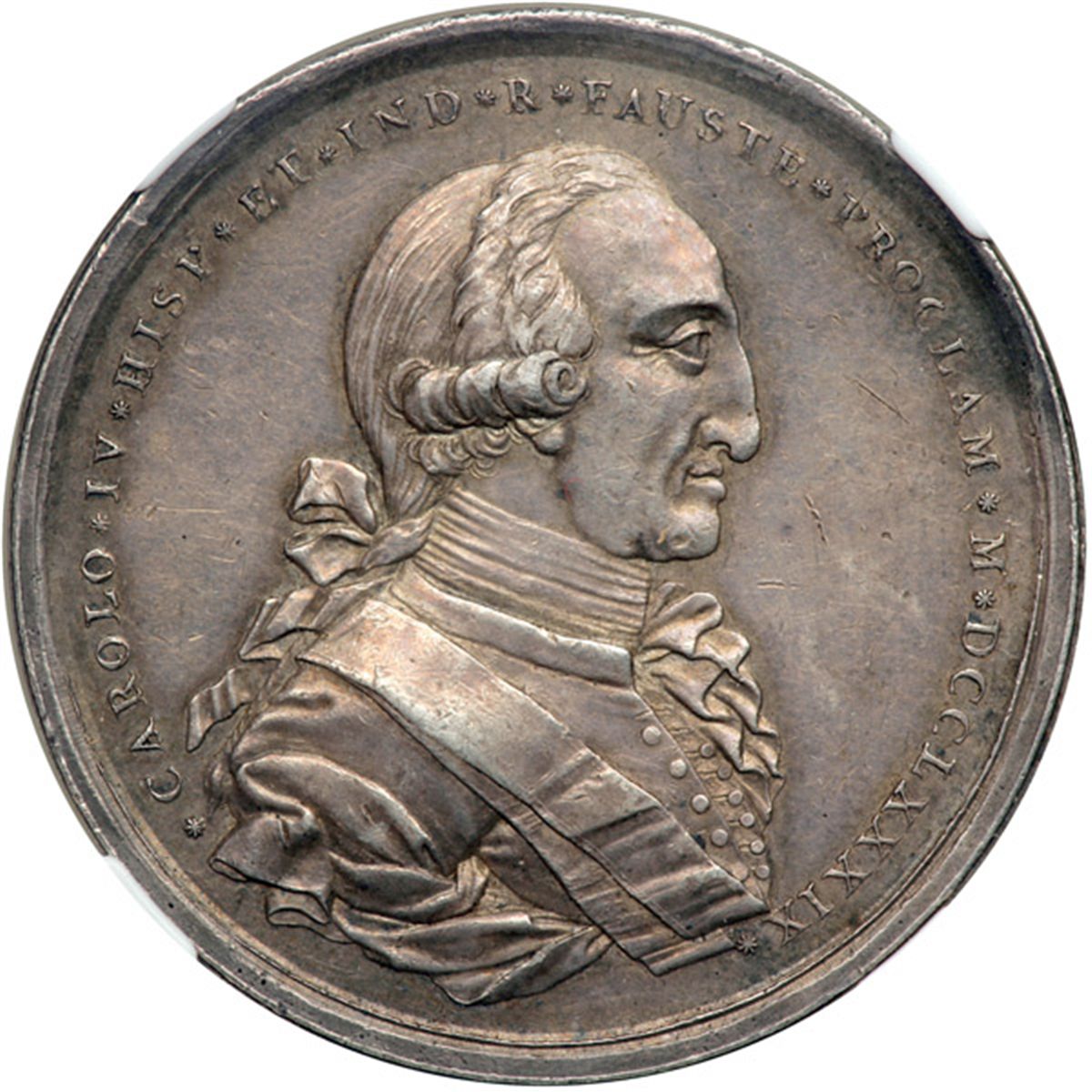 Mexico. Proclamation 8 Reales, 1789. Grove-C70. Silver. 39 mm. G.A. Gil. Charles IV. Uniformed bust right. Reverse: Hatted arms. Guadalajara El Obispo. Toned. NGC graded AU-53.