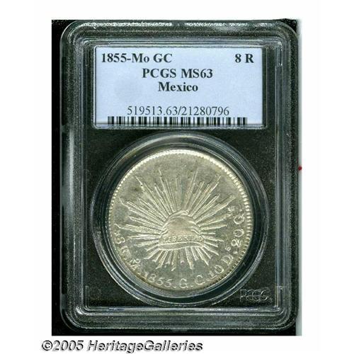 <B>Republic 8 Reales 1855 Mo-GC,</B></I> KM377.10, MS63 PCGS. Prooflike surfaces with a few light abrasions.
