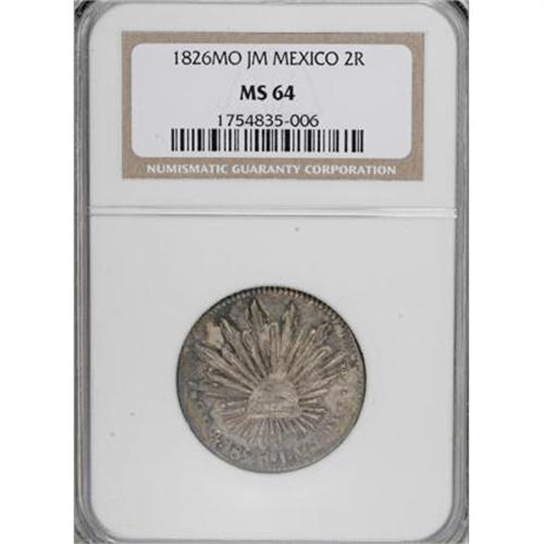 <B>Republic Cap and Rays 2 Reales 1826 Mo-JM, </B></I> KM374.10, MS64 NGC. Nice original toning over full luster with a full snake.<BR><BR><b>Shipping:</b> Coins & Currency (<a target="_blank" href="http://www.heritageauctions.com/common/shipping.php">view shipping information</a>)
