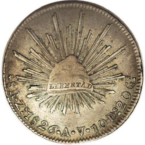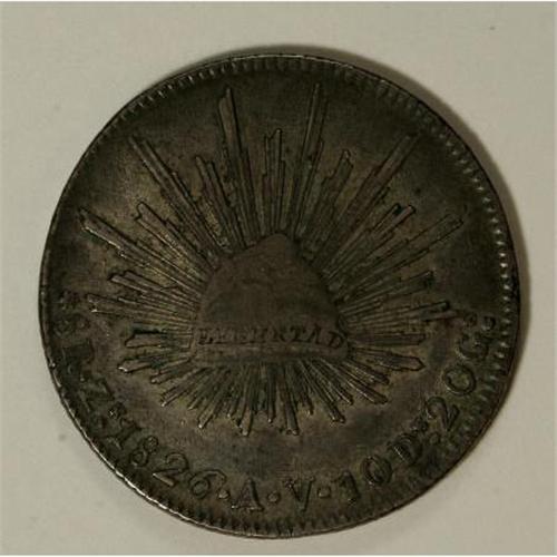 <B>Republic Cap and Rays 8 Reales 1826 Zs-AV,</B></I> KM377.13, VF-XF. A rare date, often underrated.<BR><BR><b>Shipping:</b> Coins & Currency (<a target="_blank" href="http://www.heritageauctions.com/common/shipping.php">view shipping information</a>)