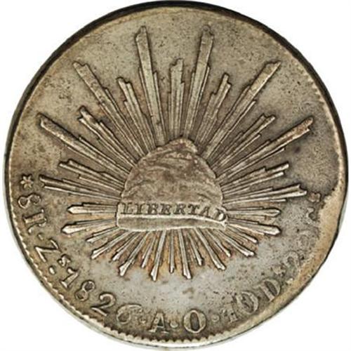 <B>Republic Cap and Rays 8 Reales 1826 Zs-AO,</B></I> KM377.13, XF details with rim bumps. A very rare issue.<BR><BR><b>Shipping:</b> Coins & Currency (<a target="_blank" href="http://www.heritageauctions.com/common/shipping.php">view shipping information</a>)