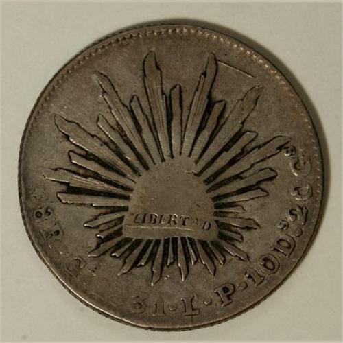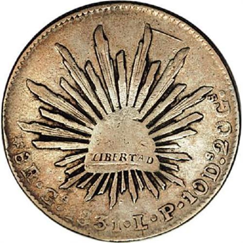 <B>Republic Cap and Rays 8 Reales 1831 Ga-LP, L/F assayer,</B></I> KM377.6, F/VF with an obverse scratch. As with the previous lot, most examples of this issue are seen with a Philippines Fo counterstamp and examples without the counterstamp are rare.<BR><BR><b>Shipping:</b> Coins & Currency (<a target="_blank" href="http://www.heritageauctions.com/common/shipping.php">view shipping information</a>)