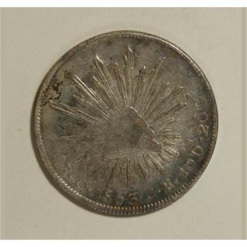 <B>Republic Cap and Rays 8 Reales 1853 C-CE,</B></I> KM377.3, Mexican Cap, Fine. Very scarce.<BR><BR><b>Shipping:</b> Coins & Currency (<a target="_blank" href="http://www.heritageauctions.com/common/shipping.php">view shipping information</a>)