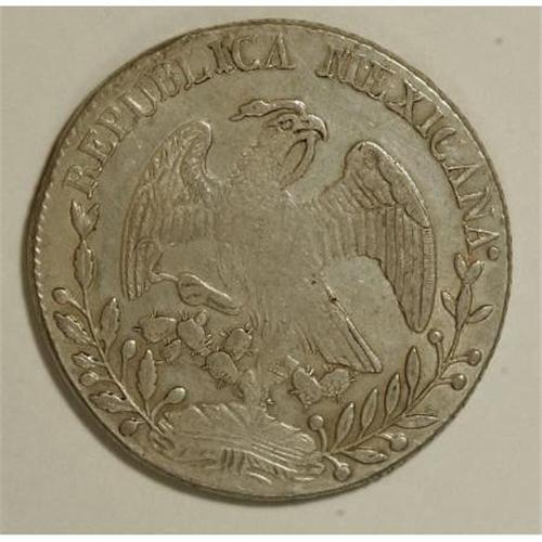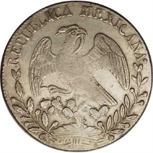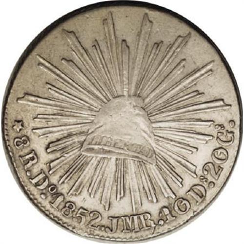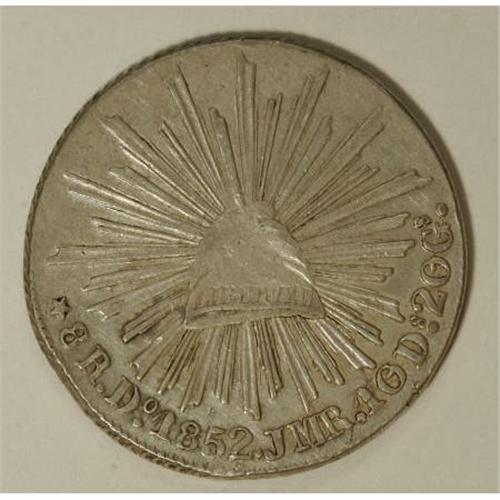 <B>Republic Cap and Rays 8 Reales 1852 Do-JMR,</B></I> KM377.4, XF with normal central weakness on the reverse. Very scarce.<BR><BR><b>Shipping:</b> Coins & Currency (<a target="_blank" href="http://www.heritageauctions.com/common/shipping.php">view shipping information</a>)