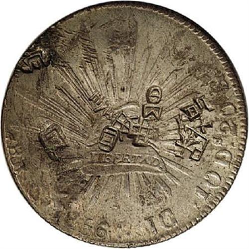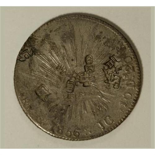 <B>Republic Cap and Rays 8 Reales 1856 Ca-JC,</B></I> KM377.2 (this date unlisted), lustrous XF details with numerous chopmarks on both sides. Dunigan and Parker state in Resplandores, "Extremely rare and very underrated. So elusive is this coin that it has been omitted from major reference works because the authors had never seen one" Well, here is their chance to see one!<BR><BR><b>Shipping:</b> Coins & Currency (<a target="_blank" href="http://www.heritageauctions.com/common/shipping.php">view shipping information</a>)