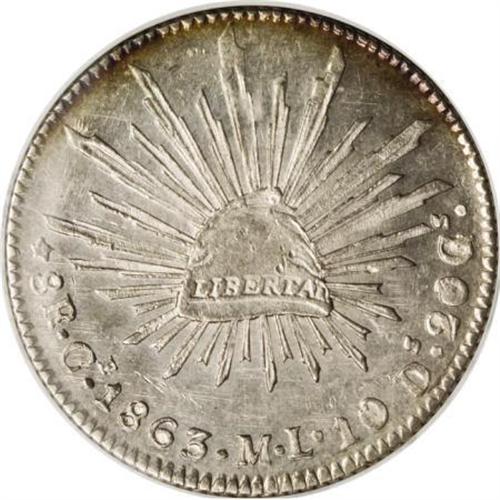 <B>Republic Cap and Rays 8 Reales 1863 Ce-ML,</B></I> KM377.1, AU58 NGC. Fully lustrous with a decent strike for the issue. One of the nicer examples of this scarce type that we have seen.<BR><BR><b>Shipping:</b> Coins & Currency (<a target="_blank" href="http://www.heritageauctions.com/common/shipping.php">view shipping information</a>)