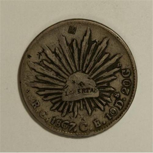 <B>Republic Cap and Rays 8 Reales 1867 C-CE,</B></I> KM377.3, Fine with small chopmarks on both sides. Very scarce. <BR><BR><b>Shipping:</b> Coins & Currency (<a target="_blank" href="http://www.heritageauctions.com/common/shipping.php">view shipping information</a>)