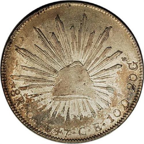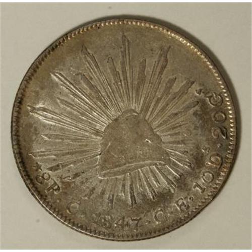 <B>Republic Cap and Rays 8 Reales 1847 C-CE,</B></I> KM377.3, VF. Very rare and the most elusive issue from the Culican mint.<BR><BR><b>Shipping:</b> Coins & Currency (<a target="_blank" href="http://www.heritageauctions.com/common/shipping.php">view shipping information</a>)