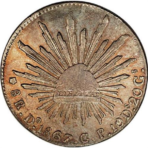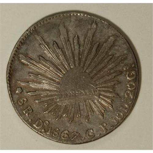 <B>Republic Cap and Rays 8 Reales 1867 Do-CP,</B></I> KM377.4, VF. Very scarce.<BR><BR><b>Shipping:</b> Coins & Currency (<a target="_blank" href="http://www.heritageauctions.com/common/shipping.php">view shipping information</a>)
